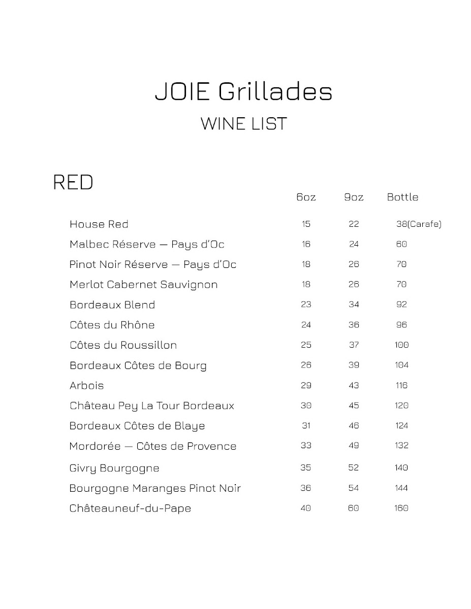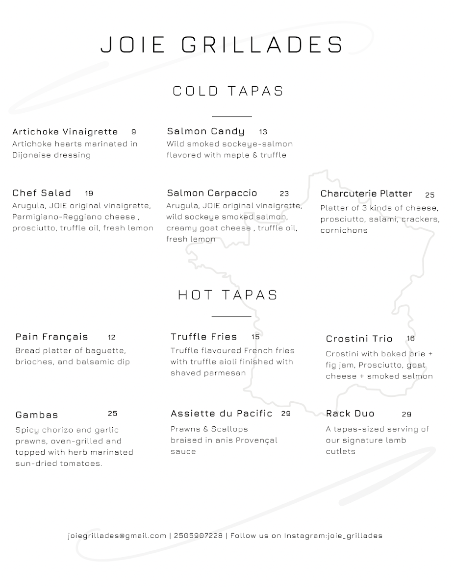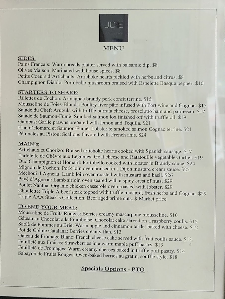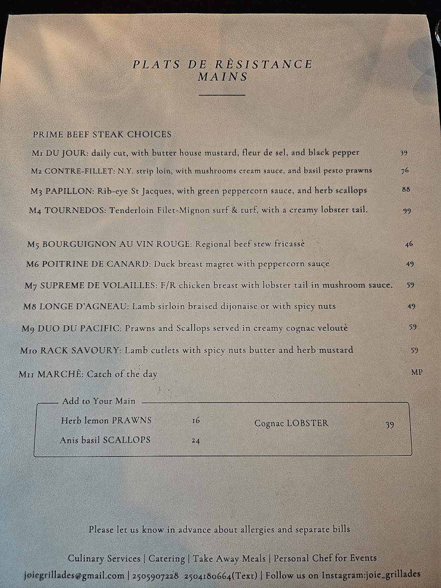 The main courses showcase the heart of the menu, with dishes such as Feuilleté De Chèvre Aux Légumes for those seeking a vegetarian-forward option, the richly sauced Paleron Dijonaise, and the refined Saumon Du Pacific Duo De Champignons Et Homard, which highlights premium seafood. The Suprême De Volaille Crème Nantua stands out for its classic French comfort and depth of flavor. To conclude, desserts like Gâteau Au Fromage Blanc, Sablé De Pommes Au Brie, Gâteau Au Chocolat À La Framboise, and Feuilleté De Fromage provide a satisfying and elegant finish. Overall, the menu at Joie Grillades feels cohesive and carefully curated, making it a fitting finale to a refined dining experience in Victoria.