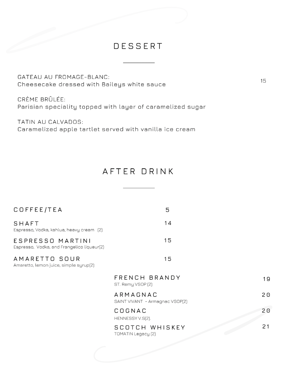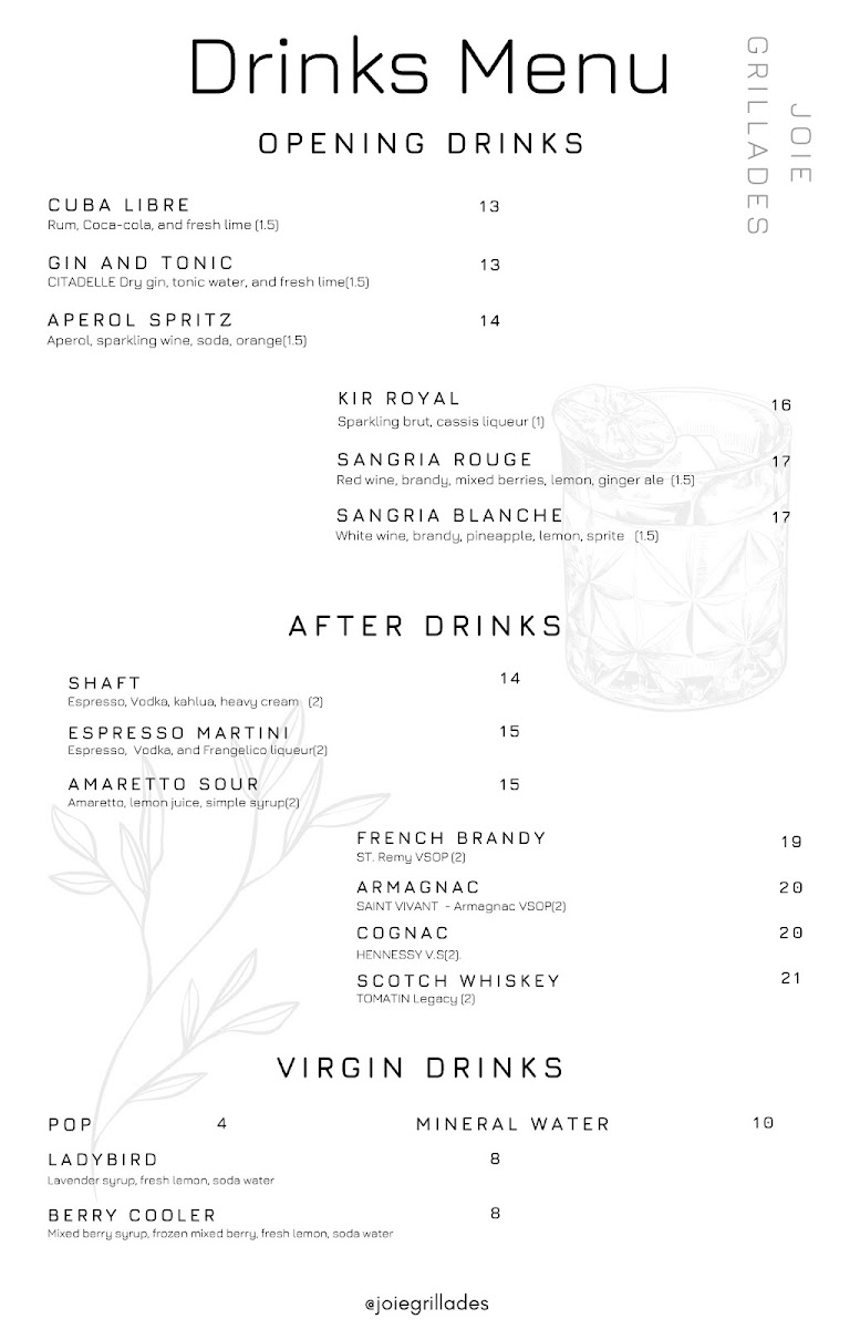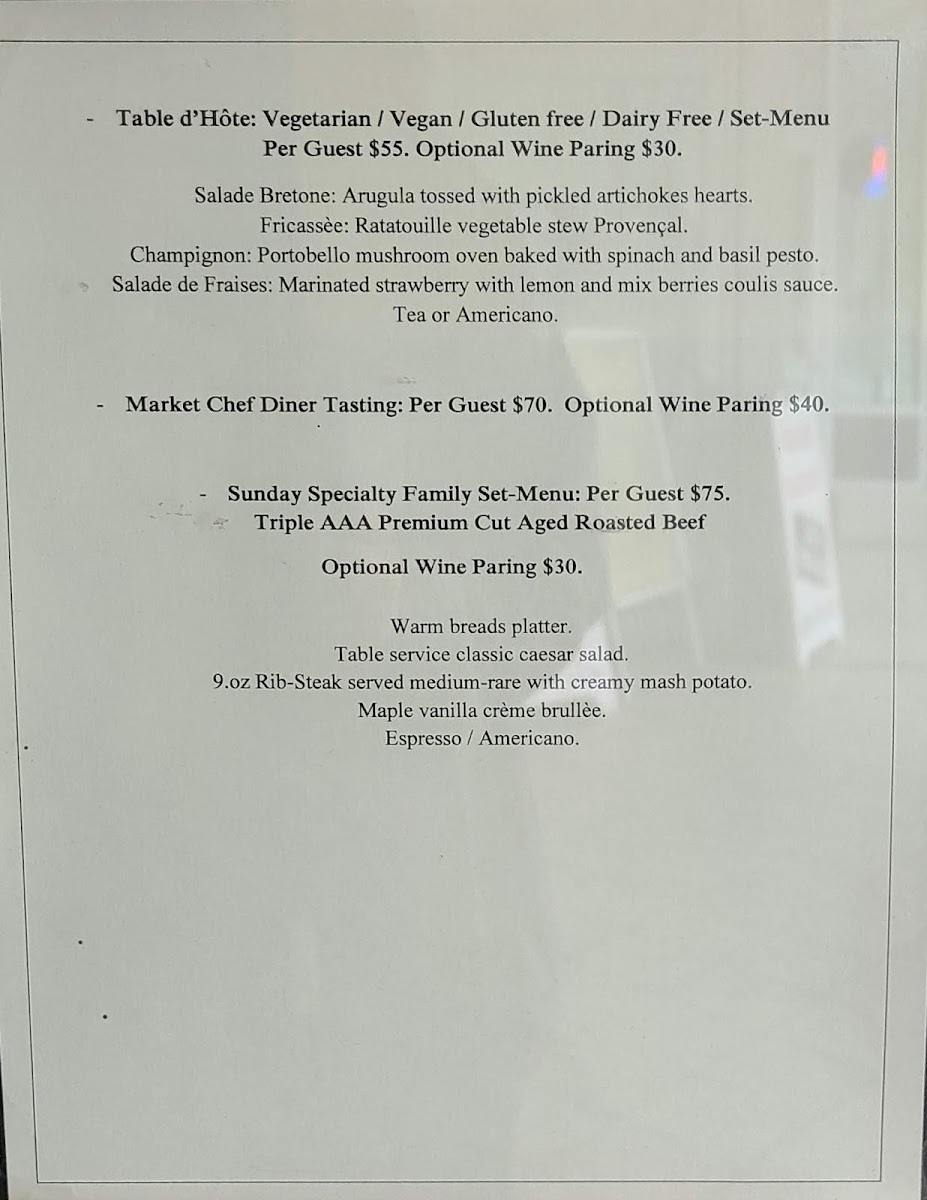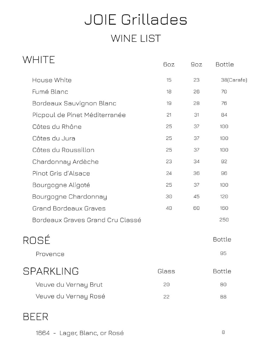 The main courses showcase the heart of the menu, with dishes such as Feuilleté De Chèvre Aux Légumes for those seeking a vegetarian-forward option, the richly sauced Paleron Dijonaise, and the refined Saumon Du Pacific Duo De Champignons Et Homard, which highlights premium seafood. The Suprême De Volaille Crème Nantua stands out for its classic French comfort and depth of flavor. To conclude, desserts like Gâteau Au Fromage Blanc, Sablé De Pommes Au Brie, Gâteau Au Chocolat À La Framboise, and Feuilleté De Fromage provide a satisfying and elegant finish. Overall, the menu at Joie Grillades feels cohesive and carefully curated, making it a fitting finale to a refined dining experience in Victoria.