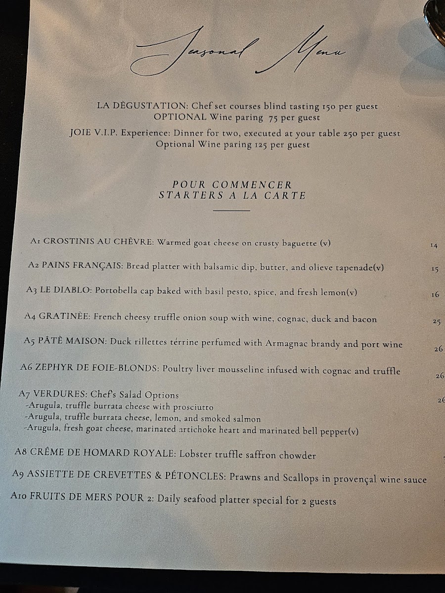 From a reviewer’s perspective, the menu at Joie Grillades reflects a thoughtful balance between French culinary tradition and refined contemporary tastes. The experience often begins with elegant starters such as Pétoncles Saint-Jacques Au Pistou, Flan D’Homard Et Saumon-Fumé, or the delicate Mousseline De Foies-Blonds, each offering layered flavors and careful presentation. Lighter options like Salade De Saumon-Fumé and Salade D’Artichauts provide freshness and contrast, while sides including Pains Français, Champignon Diablo, Petits Cœurs D’Artichauts, and Olives Maison subtly enhance the overall meal without overpowering it.
